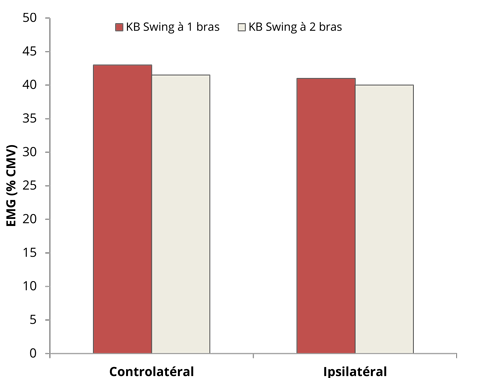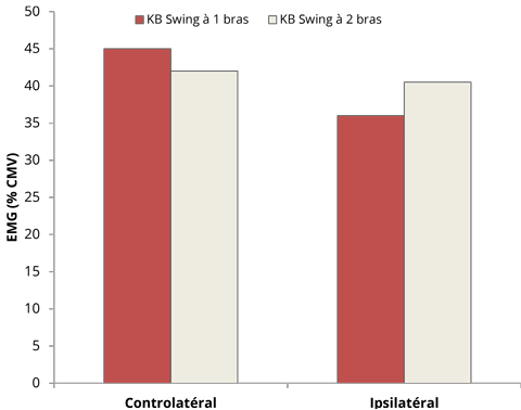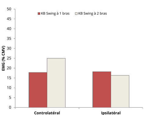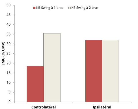 Parmi ces approches, il est possible d’inclure le travail unilatéral qui semble supérieur à au travail bilatéral pour le recrutement des muscles stabilisateurs controlatéraux (i.e., les muscles du côté opposé), qui luttent contre la torsion du buste. La plupart des études ont montré que l’activation des muscles stabilisateurs était supérieure en travail unilatéral du côté controlatéral en comparaison au travail bilatéral, lui-même supérieur au travail unilatéral du côté ipsilatéral (i.e., du même côté). Qu’en est-il lors du Kettlebell Swing ?.