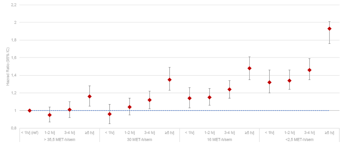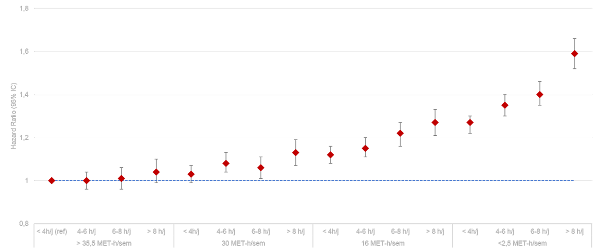 Les principaux résultats de cette étude montrent qu’en comparaison avec le groupe de référence (ceux qui s’assoient le moins et qui sont les plus actifs), la mortalité lors du suivi était 12 à 59% plus grande pour les deux groupes les moins actifs (Fig. 1). Dans le second groupe le plus actif, seules les personnes assises plus de 4 heures avaient une mortalité plus élevée que celle observée dans le groupe de référence. Parmi les personnes les plus actives, les données n’ont montré aucune relation significative entre le temps passé assis et la mortalité, cela suggère qu’une quantité importante d’activité physique permet d’éliminer le risque accru de mortalité lié à la position assise. Les personnes qui étaient les plus actives physiquement et qui s’asseyaient plus de 8 heures par jour avaient un risque de mortalité moins élevé que les personnes les moins actives qui s’asseyaient moins de 4 heures par jour.