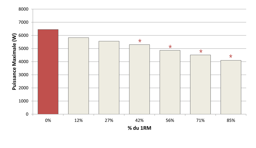 Les principaux résultats de cette étude montrent que les charges optimales (i.e., la charge qui maximise la production de puissance) sont respectivement de 0%, 56% et 80% du 1RM pour le CMJ (Fig. 2), le Squat (Fig. 3) et le Power Clean (Fig. 4).