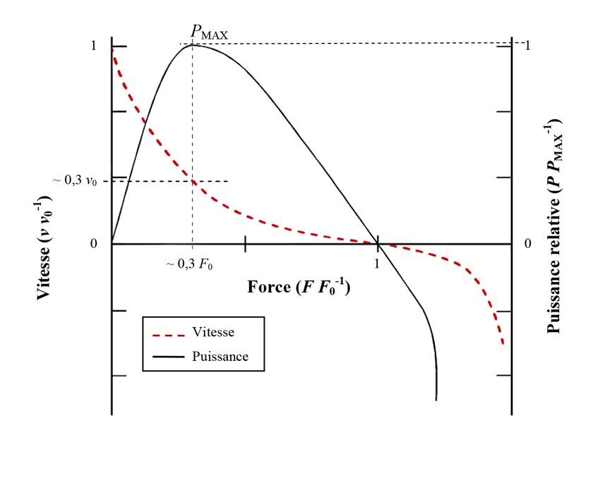 La relation de Force-Vitesse du muscle indique que l’augmentation de la vitesse de raccourcissement entraîne une diminution de la production de force, et réciproquement. La puissance musculaire étant le produit de la force et de la vitesse, lorsque le muscle est activé maximalement contre différentes charges, il existe une charge dite optimale qui permet la production maximale de puissance. Sur une fibre musculaire isolée, Hill en 1938 a constaté que cette force optimale correspondait à environ 30% de la force maximale isométrique. Ce qui pourrait laisser penser que travailler à 30% du 1RM permettrait de développer son plein potentiel de puissance…