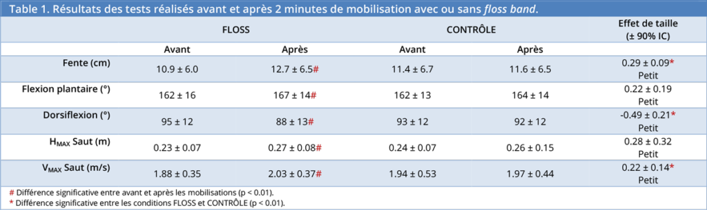 Les principaux résultats de cette étude montrent que la mobilisation de la cheville avec une floss band durant 2 minutes permet d’améliorer significativement la dorsiflexion, la flexion plantaire, la hauteur de saut et la vitesse de saut. En comparaison la mobilisation sans bande de la cheville contrôle n’a abouti à aucune amélioration significative. En revanche, lorsque l’on compare les deux chevilles, seules la dorsiflexion et la vitesse maximale de saut sont significativement supérieures (bien que l’effet de taille soit petit) après la mobilisation avec floss band (Table 1).