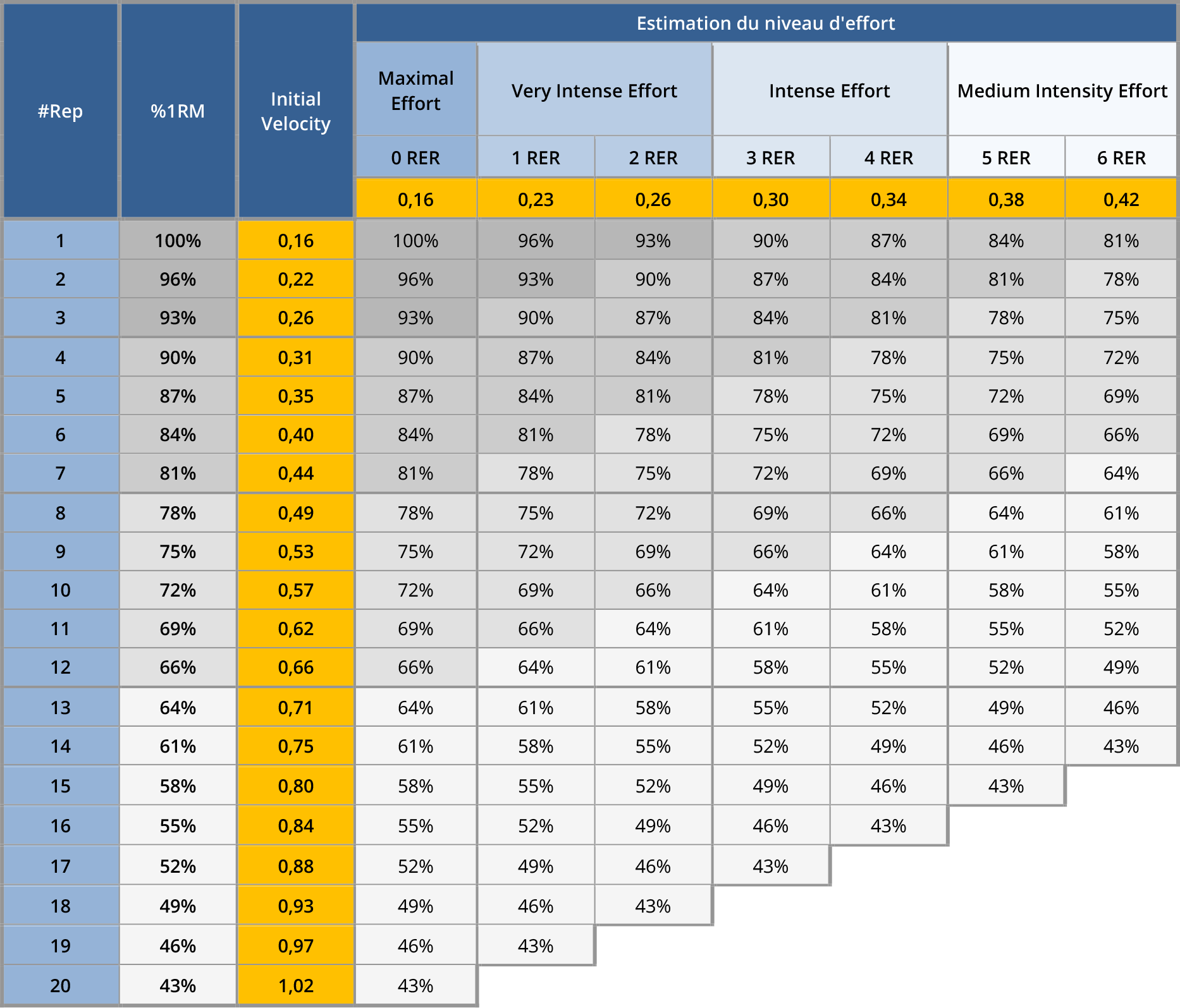 Figure 8 gives a clear example of what can be done from Load-Velocity and RM-Velocity profiles. This table may seem complex at first but let’s take the time to analyze each part separately. The three left-hand columns correspond to the Load-Velocity profile information, matching each percentage of relative load with an initial velocity. The term initial velocity here designates the bar speed that can be expected to be achieved during the first repetition, for a given percentage of 1RM. The following three lines at the top of the table allow you to estimate a level of effort, and match the speeds of your RM-Velocity profile with a RIR level, as well as a description of the level of effort. The percentage values of the load below allow the deduction of work intensities according to the level of effort desired. Let us take again for the last time our example of programming composed of 3 sets of 8 repetitions at 70% of 1RM, whose last series must not exceed a level of effort lower than 3 RER. We therefore start by looking for the initial velocity value corresponding to 70% of 1RM, here 0.60 m/s. During the specific warm-up, the goal will then be to determine the highest load with which it is possible to reach 0.60 m/s. The minimum speed threshold corresponding to 3 RIR here is 0.30 m/s. In the end, we will have the following working format :