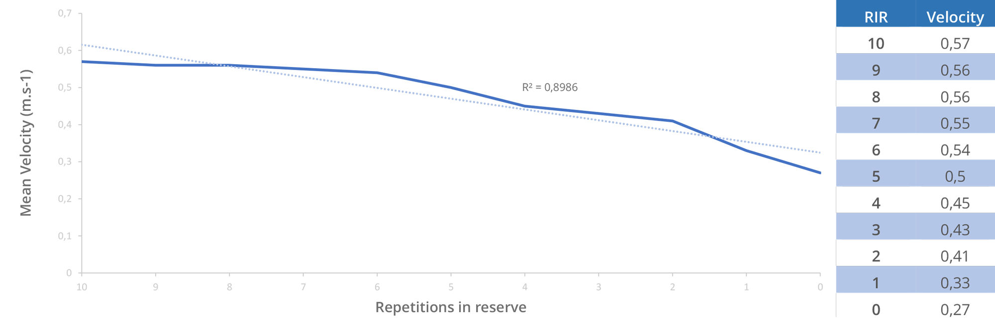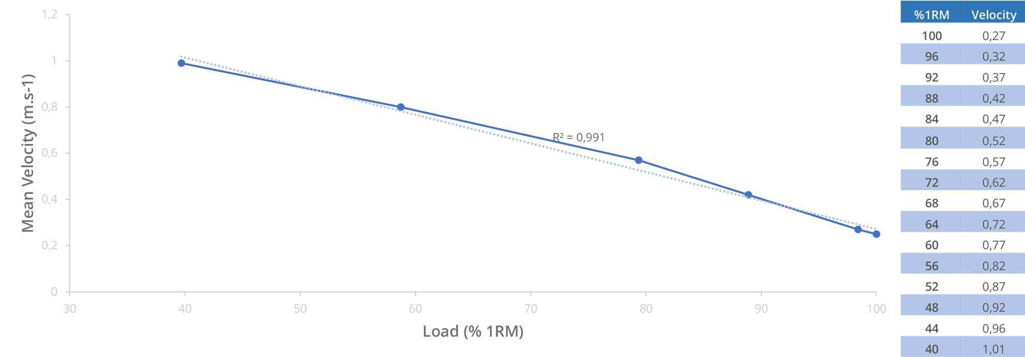 Note that this incremental protocol requires a preliminary estimation of your 1RM, in order to calculate the specific loads at each level. However, this protocol is provided as an example. Nothing prevents you from including additional load levels if you think you need it. On each repetition of the protocol, you must note the load and the speed reached for the same load. On the 20, 40 and 60% relative loads you are asked to perform three repetitions, remember only the fastest repetitions. Take three minutes of recovery between each series at intensities of 20, 40, 60 and 80% 1RM, then five minutes between each series corresponding to intensities of 80, 90 and 100% 1RM. Once your estimated maximum load is reached, decrease or increase this load by increment or decrement from 0.5 to 5 kg, always keeping 5 minutes of recovery between each test. Once your data is collected, all you have to do is add it to an Excel spreadsheet and perform a simple linear regression to obtain a complete mapping of your relative speeds (Fig. 8).