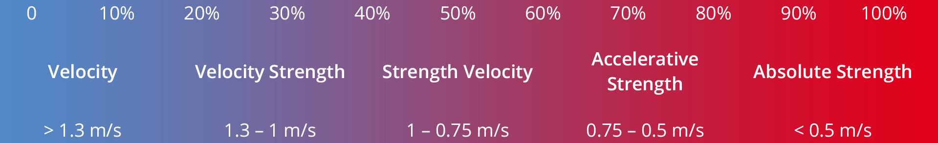 Originally, the use of this continuum was meant to be relatively simple. Depending on the purpose of the day, we select the speed zone corresponding to the quality of force that we wish to develop. Once the speed zone is chosen, all that remains is to determine the load from an increasing range and to stick to this speed zone on each of the sets of the exercise (stopping its sets when leaving the area or reducing the load). However, some physical trainers have subsequently begun to use this Force – Velocity continuum inappropriately, considering it as a speed zone repertoire adaptable to any exercise. These zones of speed vary according to the chosen exercise. For example, if the mean concentric velocity reached on a squat at 100% 1RM is, on average, 0.25 m/s, this value approaches 0.15 m/s on a bench press. Our ability to generate strength at low speeds will depend on the exercise and therefore the muscle groups involved in the movement. The result of this observation is that each of the other relative velocity values also vary from one exercise to another. If we wishe to base our training on generic profiles, we must do so from profiles established on the exercise in question, as shown in Table 1.