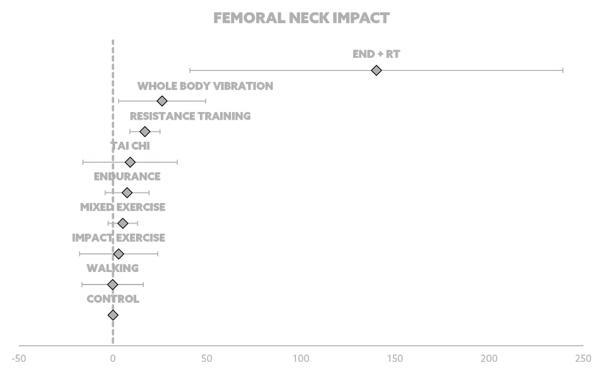 In the femoral neck, the results are slightly different. Here again, the combination of endurance and strength training dominates, followed this time by whole-body vibration, then strength training alone. The other modalities (Tai Chi, mixed exercises, impact exercises, or walking) did not show statistically significant effectiveness.