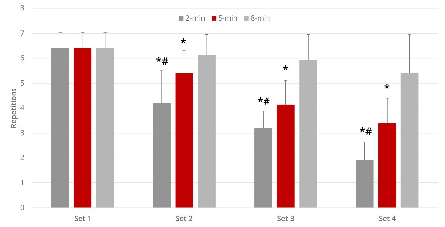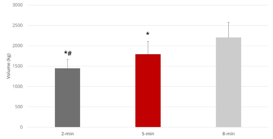Furthermore, the 8-minute inter-set rest allowed the highest training volume with a significant difference from the 2 and 5-minute rests (see Fig. 2).