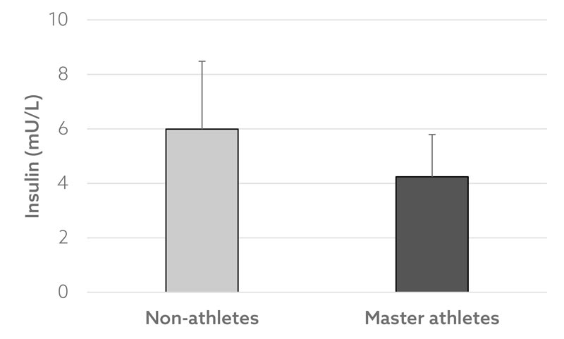 The main results of this study show that compared to sedentary and inactive individuals, insulin concentration was significantly lower, SIRT1 concentration was significantly higher, and telomere length was significantly greater in Master athletes (see Figures below). No significant differences were observed between endurance runners and sprinters.