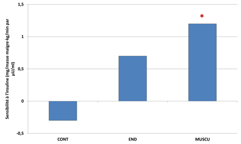 La graisse intra-hépatique est fortement associée à la résistance à l’insuline et à l’hypertriglycéridémie (i.e., excès du taux de triglycérides dans le sang) chez les adolescents. Or, que ce soit un entraînement en endurance ou en musculation, l’activité physique permet une diminution de cette graisse. Et même si seul l’entraînement en musculation a démontré avoir une influence significative sur la sensibilité à l’insuline (Fig. 2) (+ 28%), l’entraînement aérobie a également permis une amélioration, non significative, de 19%. Différentes études ont rapporté que l’amélioration de la sensibilité à l’insuline était liée à l’amélioration du niveau aérobie et de la masse musculaire. Or le groupe END a eu un faible gain de masse musculaire, non significatif, en comparaison au groupe MUSCU (Fig. 4).