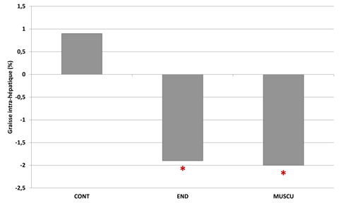 Pour évaluer l’impact de l’entraînement, les chercheurs ont évalué, avant et après les 12 semaines du protocole, la composition corporelle des participants en mesurant la masse corporelle, la masse grasse totale, abdominale et viscérale et la masse musculaire squelettique. Ils ont également mesuré le niveau de lipides intra-hépatique ainsi que la concentration de lipides intra-myocellulaires. Enfin, ils ont mesuré la sensibilité à l’insuline.