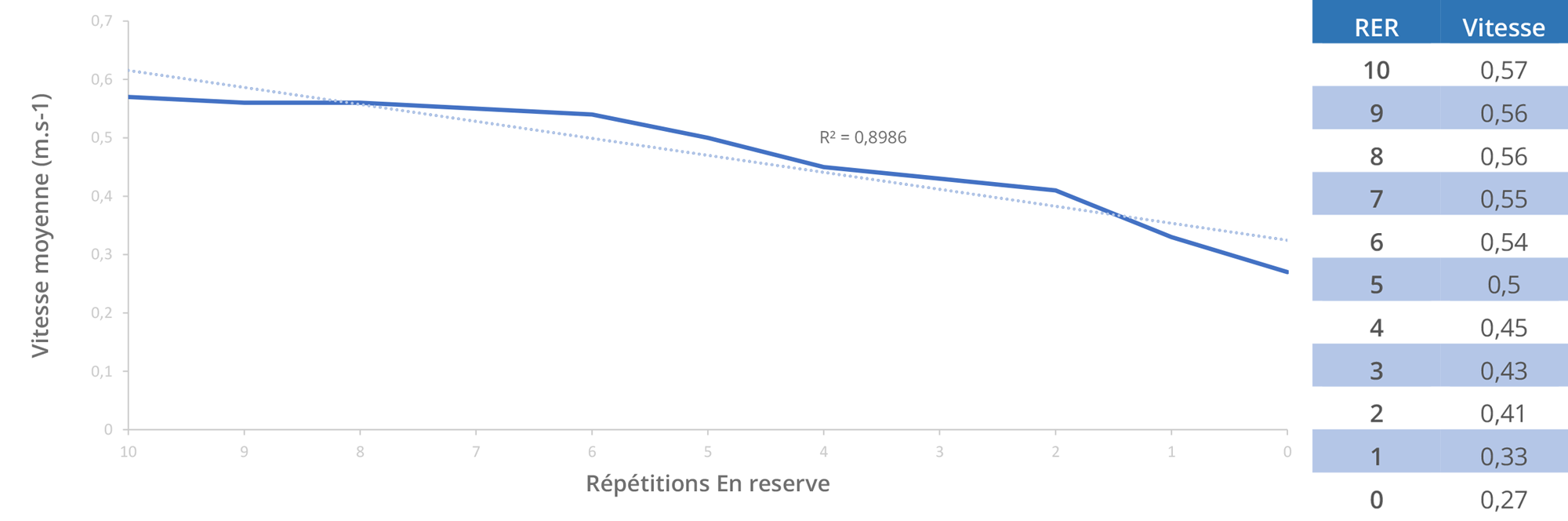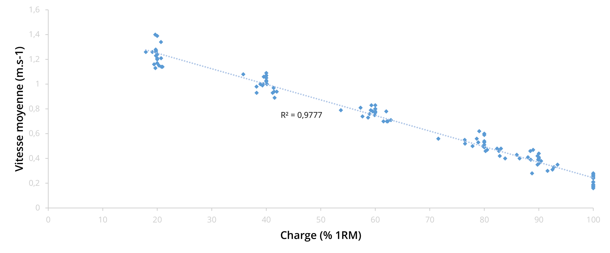 Notez que ce protocole incrémental requiert une estimation préalable de votre 1RM, afin de calculer les charges spécifiques à chaque palier. Cependant, ce protocole est fourni à titre d’exemple. Rien ne vous empêche d’inclure des paliers de charge supplémentaire si vous considérez en avoir besoin. Sur chaque répétition du protocole, il vous faut noter la charge ainsi que la vitesse atteinte pour cette même charge. Sur les charges relatives de 20, 40 et 60% sur lesquelles il vous est demandé d’effectuer trois répétitions, ne retenez que la répétition la plus rapide. Prenez trois minutes de récupération entre chaque série sur les intensités de 20, 40, 60 et 80% de 1RM, puis cinq minutes entre chaque série correspondant aux intensités de 80, 90 et 100% de 1RM. Une fois votre charge maximale estimée atteinte, diminuez ou augmentez cette charge par incrément ou décrément de 0,5 à 5 kg, en gardant toujours 5 minutes de récupération entre chaque essai. Une fois vos données recueillies, il ne vous reste plus qu’à les intégrer à un tableur Excel et d’effectuer une simple régression linaire afin d’obtenir un mapping complet de vos vitesses relatives (Fig. 8).