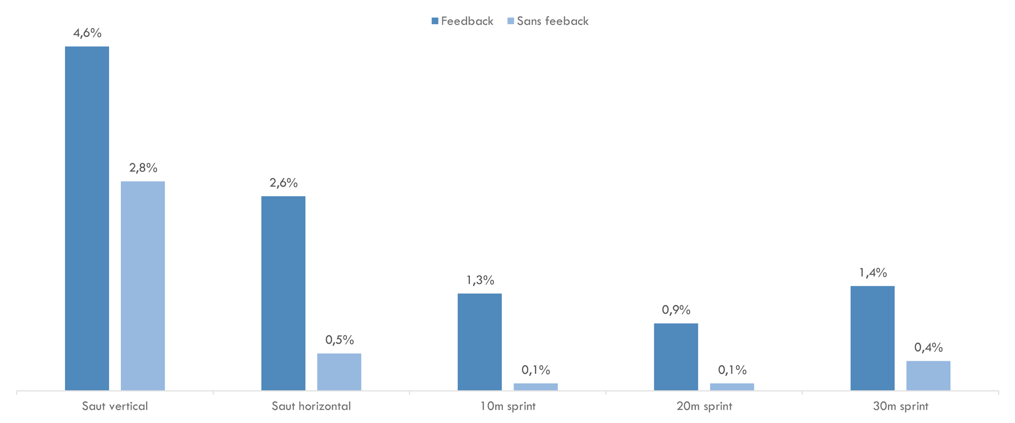 En 2011, une étude néo-zélandaise a cherché à évaluer l’impact que pouvait avoir le fait de donner un feedback relatif à la vitesse d’exécution sur la performance sportive (Randell et al., 2011). Pour y parvenir, treize joueurs de rugby professionnels ont été aléatoirement répartis en deux groupes, pour ensuite tous suivre le même entrainement en musculation. Durant six semaines, les joueurs du premier groupe recevaient un feedback immédiat quant à leurs vitesses d’exécution, tandis que les joueurs du groupe 2, n’en recevaient pas. Des tests de détente verticale et de détente horizontale, ainsi que des tests de sprint sur 10, 20 et 30 m ont été effectués au début et à la fin de l’intervention. Au terme des six semaines, les chercheurs se sont aperçus que les athlètes ayant reçu un feedback sur leur vitesse d’exécution avaient, en moyenne, beaucoup plus progressé que ceux qui n’en avaient pas reçu (Fig. 4).