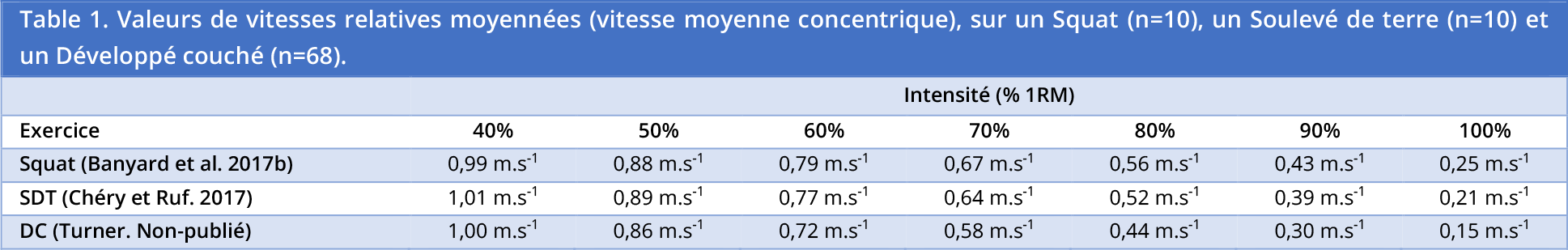 À l’origine, l’utilisation de ce continuum se voulait relativement simple. En fonction de l’objectif du jour, on sélectionne la zone de vitesse correspondante à la qualité de force que l’on souhaite développer. Une fois la zone de vitesse choisie, il ne reste plus qu’a déterminer la charge de travail à partir d’une gamme montante et de se cantonner à cette zone de vitesse sur chacune des séries de l’exercice (en arrêtant sa série lorsque l’on sort de la zone ou en diminuant la charge de travail). Cependant, certains préparateurs physiques ont par la suite commencé à utiliser ce continuum Force–Vitesse de manière inadéquate, en le considérant comme un répertoire de zone de vitesse adaptable à tout exercice. Ces zones de vitesse varient en effet en fonction de l’exercice choisi. Par exemple, si la vitesse moyenne concentrique atteinte sur un squat à 100% de 1RM équivaut, en moyenne, à 0,25 m/s cette valeur avoisine les 0,15 m/s sur un développé couché. Notre capacité à générer de la force à basse vitesse va dépendre de l’exercice et donc des groupes musculaires impliqués dans le mouvement. La réciproque résultante de cette observation est que chacune des autres valeurs de vitesses relatives varient également d’un exercice à l’autre. Si l’on souhaite baser son entrainement sur des profils génériques, il faut donc le faire à partir de profils établis sur l’exercice en question, tel qu’illustré dans la Table 1.