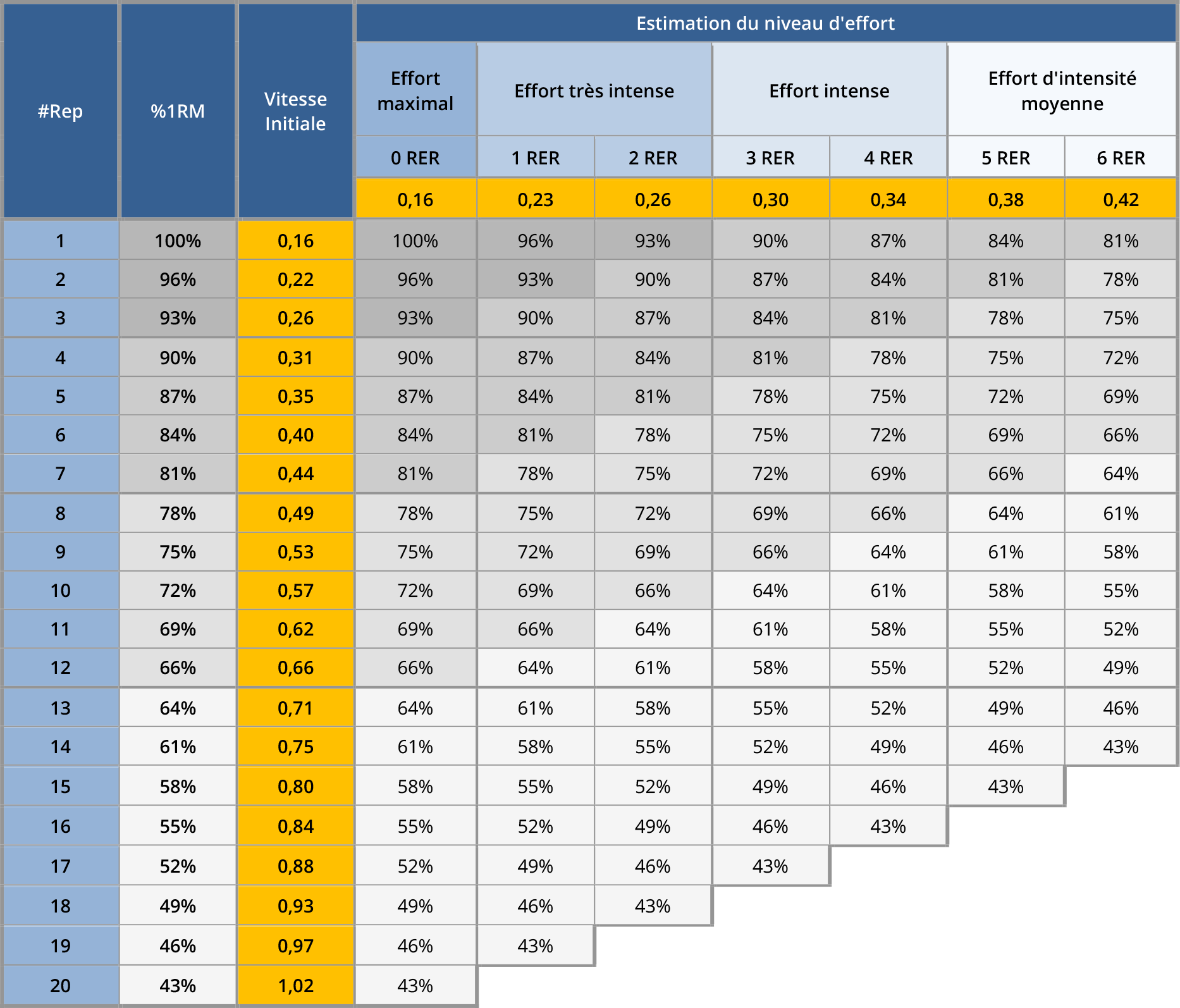 La figure 8 nous donne un exemple concret de ce qu’il est possible de faire à partir de profils Charge–Vitesse et RM–Vitesse. Ce tableau pouvant paraitre complexe au premier abord, prenons le temps d’analyser chaque partie séparément. Les trois colonnes de gauche correspondent aux informations relatives au profil Charge–Vitesse, faisant correspondre à chaque pourcentage de charge relative une vitesse initiale. Le terme de vitesse initiale désigne ici la vitesse de barre que l’on peut espérer atteindre lors de la première répétition, pour un pourcentage de 1RM déterminé. Les trois lignes suivantes en haut du tableau permettent d’estimer un niveau d’effort, et font correspondre les vitesses de votre profil RM–Vitesse avec un niveau de RER, ainsi qu’avec un descriptif du niveau d’effort. Les valeurs de pourcentage de charge en dessous permettent de déduire des intensités de travail en fonction du niveau d’effort souhaité. Reprenons encore une dernière fois notre exemple de programmation composé de 3 séries de 8 répétitions à 70% de 1RM, dont la dernière série ne doit pas excéder un niveau d’effort inférieur à 3 RER. On commence donc par rechercher la valeur de vitesse initiale correspondant à 70% de 1RM, soit ici 0,60 m/s. Au cours de la gamme montante, l’objectif sera alors de déterminer la plus haute charge avec laquelle il est possible d’atteindre les 0,60 m/s. Le seuil de vitesse minimale correspondant à 3 RER équivaut ici à 0,30 m/s. Au final, on aura donc le format de travail suivant :