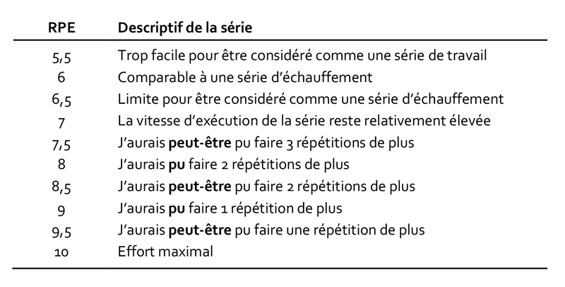 Sans rentrer dans les détails concernant l’utilisation de tels outils, ces échelles servent entre autres à estimer la charge interne en musculation (Day et al., 2004; McGuigan et al. 2004; Zourdos et al., 2016) et donc à effectuer des ajustements au niveau des paramètres de l’entrainement. Ces méthodes subjectives peuvent être une alternative pertinente à l’emploi d’une programmation traditionnelle seule, car elles permettent d’introduire une certaine forme d’autorégulation dans l’entrainement. Ces échelles de mesure ne sont toutefois pas adaptées à un public débutant (Zourdos et al., 2016), qui ne fait pas encore le lien entre certaines sensations intéroceptives et le niveau de fatigue correspondant. Elles s’adaptent mieux aux pratiquants plus avancés qui, de par leur expérience, se sont construit des repères sensoriels internes leur permettant d’estimer le nombre de répétitions en réserve lors de l’exécution d’une série. Grâce à ces échelles d’évaluations subjectives de la charge, il est donc possible d’effectuer des ajustements d’une séance à l’autre en fonction des retours de l’athlète, ou encore de simplifier le travail de programmation des exercices d’assistance. Cependant, elles trouvent vite leurs limites lors de la programmation des exercices principaux tels que le squat, le développé couché ou le soulevé de terre. Il est en effet difficile, et à mon sens risqué, de baser sa programmation entièrement sur ce type de méthode, à moins d’avoir en face de soi un athlète ayant une grosse expérience en musculation.