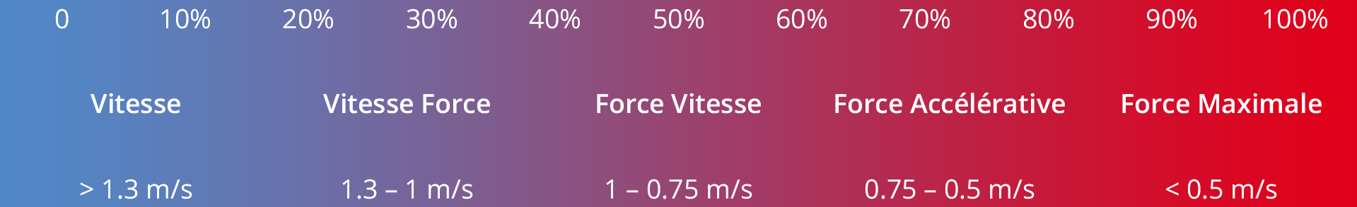 Les nomenclatures et définitions caractérisant les différentes zones de vitesse (force–vitesse, vitesse–force, etc.) variant d’un auteur à l’autre, libre à vous de les inclure (ou non) au sein de chaque continuum en fonction de vos préférences. Une telle utilisation de zones de vitesses génériques est pratique car elles ne requièrent pas le passage d’un test de 1RM pour être mises en place. Cette méthode s’adapte donc parfaitement à un public débutant. La principale limite de cette approche vient de la légère variabilité qu’il existe entre chaque profil individuel. Bien que cette limitation n’empêche en aucun cas l’utilisation de ce procédé de programmation, une approche basée sur l’utilisation des profils Charge-Vitesse individualisés permettra de gagner en précision dans la prescription des intensités de travail des pratiquants plus avancés.