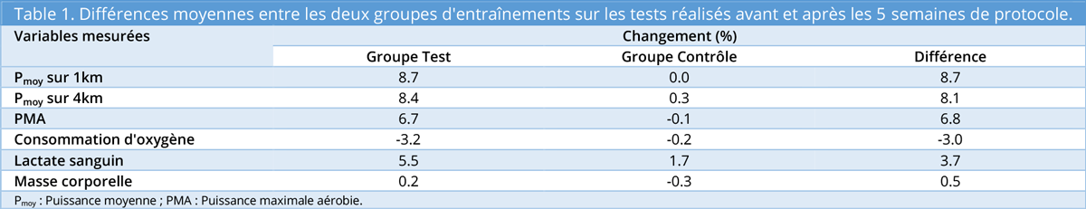 En moyenne, les deux groupes ont effectué le même nombre d’heures d’entraînement/compétitions hebdomadaires (~ 12 heures / semaine). Et pour le groupe Test, entre la 1ère et la seconde séance d’entraînement, la puissance moyenne lors des sprints a augmenté en moyenne de ~5%, et entre la séance 2 et 12, elle a augmenté en moyenne de ~9%. La Table 1 illustre les différences au niveau des variables mesurées entre les tests avant et après les 5 semaines de protocole.