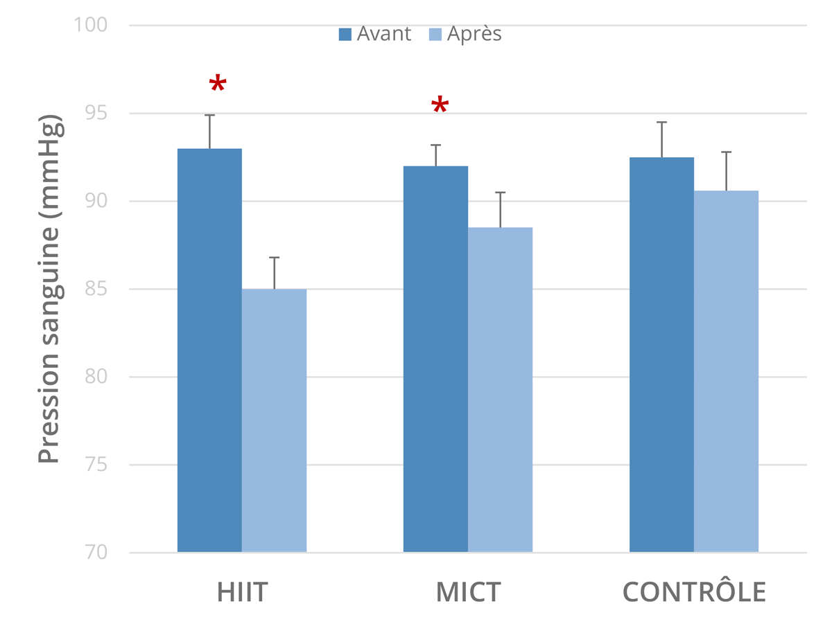 Cette étude montre que le HIIT en intervalles longs (4 x 4 minutes à 90% de FCMAX) permet de réduire significativement la tension artérielle au niveau systolique (12 mmHg) et diastolique (8 mmHg) en comparaison au MICT (4.5 / 3.5 mmHg). Et le niveau de réduction est similaire à certains médicaments prescrits pour l’hypertension. De plus, le HIIT permet une meilleure amélioration du VO2MAX. Enfin, seul le HIIT a permis d’améliorer la fonction endothéliale qui permet une meilleure vasodilatation des artères. Ce sont probablement ces améliorations (et bien d’autres) qui permettent une réduction de la tension artérielle.