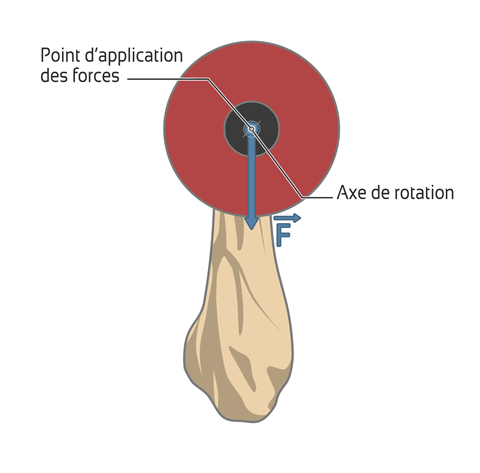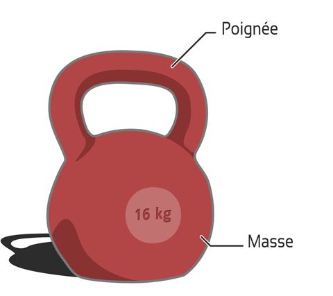 Une kettlebell est une boule de fonte รฉquipรฉe d’une poignรฉe (Fig. 1). Le dessous est plat ce qui permet ร la kettlebell d’รชtre posรฉe sans rouler. Elle se distingue d’un haltรจre classique par sa poignรฉe excentrรฉe qui lui procure l’avantage d’appliquer constamment un moment de force, quelle que soit la maniรจre dont elle sera tenue. En fait, contrairement ร un haltรจre (Fig. 2), avec une kettlebell, le point d’application des forces est รฉloignรฉ du centre de rotation (i.e., la poignรฉe) (Fig. 3).