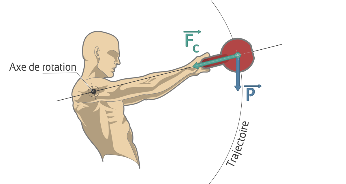 De plus, la plupart des exercices rรฉalisรฉs avec une kettlebell sont basรฉs sur le mouvement de balancier (i.e., le swing) (voir la vidรฉo du kettlebell swing). Si vous tentez les mรชmes exercices avec un haltรจre de masse รฉgale, vous constaterez rapidement, que les sensations et la difficultรฉ sont totalement diffรฉrentes. Pourquoi ? Tout simplement parce que l’une des particularitรฉs due ร la gรฉomรฉtrie du kettlebell est le dรฉplacement du centre de gravitรฉ de l’ensemble bras-kettlebell de maniรจre distale par rapport ร l’รฉpaule. Il faut donc vaincre l’inertie de la kettlebell pour la lever le plus haut possible et lors de mouvement ร trajectoire circulaire, la force centripรจte appliquรฉe sur la kettlebell est augmentรฉe. En clair, lors d’un swing, plus l’objet sera lourd, rapide et รฉloignรฉ du centre de rotation (ici, l’รฉpaule), plus la force nรฉcessaire pour maintenir une trajectoire circulaire sera importante (Fig. 4).
