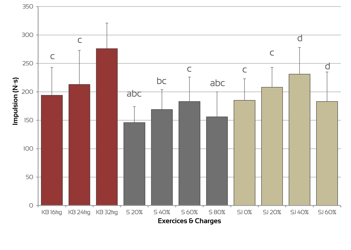 Figure 6.ย Impulsion moyenne produite durant les exercices de Kettlebell Swing (KB), de squat (S) et de Squat Jump (SJ) avec diffรฉrentes charges. a : significativement infรฉrieur ร 16kg ; b : significativement infรฉrieur ร 24kg ; c : significativement infรฉrieur ร 32kg ; d : significativement supรฉrieur ร 16kg ; e : significativement supรฉrieur ร 24kg ; f : significativement supรฉrieur ร 32kg.