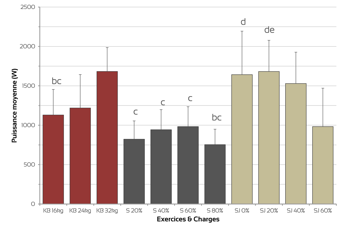 Figure 7.ย Puissance moyenne produite durant les exercices de Kettlebell Swing (KB), de squat (S) et de Squat Jump (SJ) avec diffรฉrentes charges. a : significativement infรฉrieur ร 16kg ; b : significativement infรฉrieur ร 24kg ; c : significativement infรฉrieur ร 32kg ; d : significativement supรฉrieur ร 16kg ; e : significativement supรฉrieur ร 24kg ; f : significativement supรฉrieur ร 32kg.