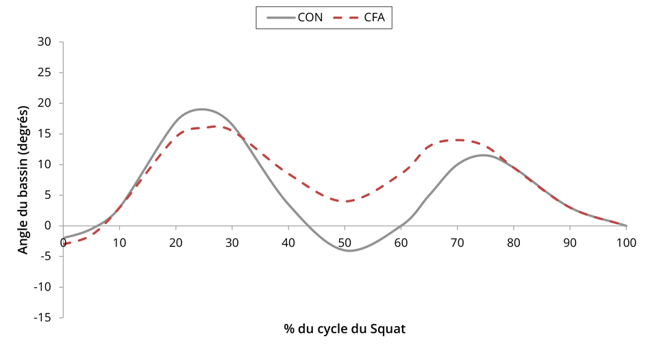 La différence de mouvement du bassin la plus marquée a lieu lorsque le bassin est au maximum de sa rétroversion au point le plus bas du squat. Les études montrent que plus le bassin est en rétroversion et moins il y a rétroversion acétabulaire (ou fémorale). La rétroversion acétabulaire (ou fémorale) est généralement associée à un CFA de type came. La rétroversion du bassin oriente l’acétabulum de telle manière que cela minimise le contact entre le bord de l’acétabulum et le fémur proximal en diminuant la couverture fémorale antérieure. Le CFA de type came cause donc une diminution de l’amplitude de mouvement du bassin dans le plan sagittal en squat, ce qui prédispose la hanche à des contacts prématurés entre le fémur proximal et le bord acétabulaire.