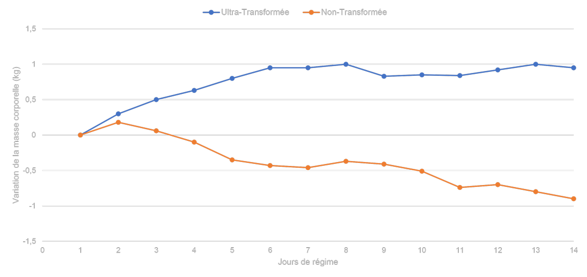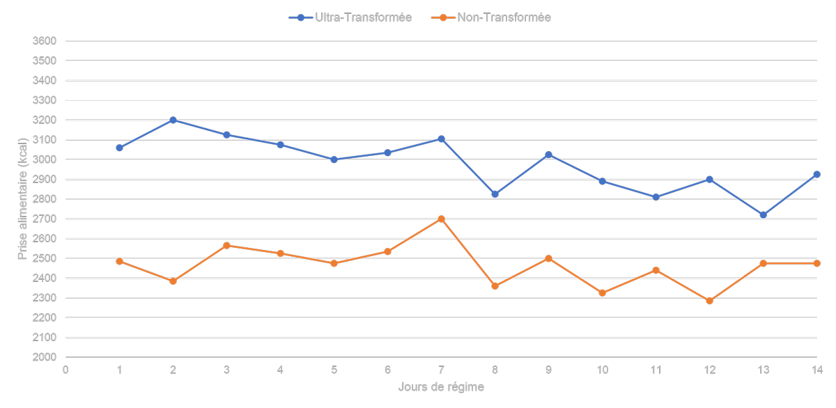 Pour répondre à cette question, une équipe de chercheurs du centre clinique de l’institut national de la santé (NIH) aux États-Unis a mis en place un protocole par essai randomisé contrôlé. Les chercheurs ont recruté 20 personnes (10 femmes et 10 hommes) qu’ils ont attribué aléatoirement à une des deux conditions de l’étude : 14 jours avec une diète basée uniquement sur des produits ultra-transformés ou 14 jours avec une diète basée uniquement sur des produits non-transformés. A l’issu des 14 jours premiers jours, les participants passaient dans l’autre groupe. L’étude a donc duré deux fois 14 jours et tous les participants ont testé les deux différentes diètes.