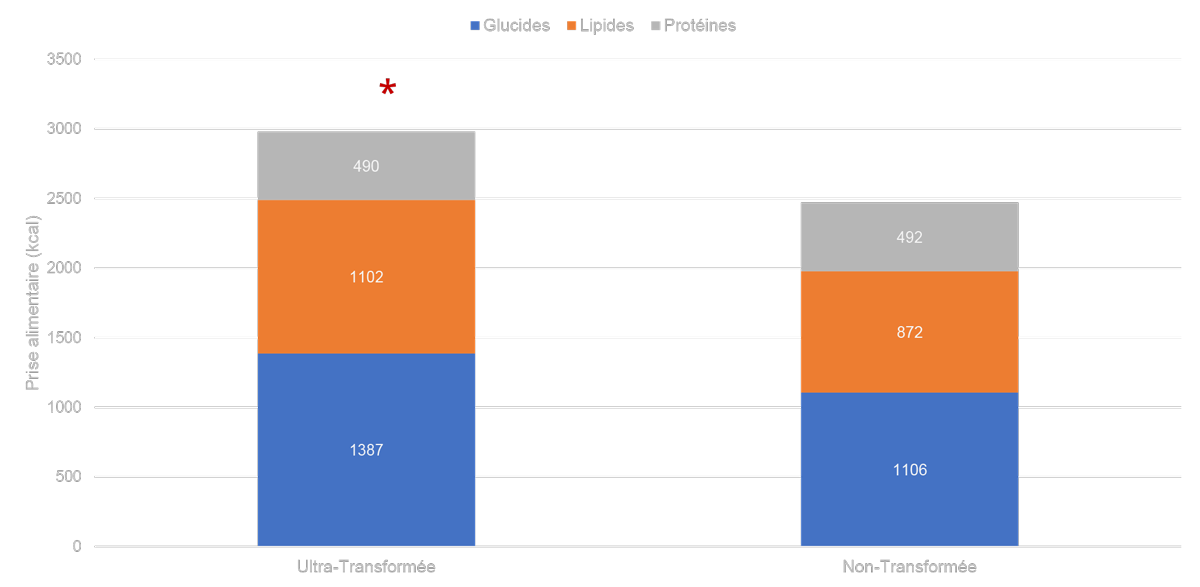 Les principaux résultats de cette étude montrent que la diète ultra-transformée a induit une consommation supérieure de calories (environ 508 ± 106 kcal/jour) (Fig. 1) due principalement à une prise plus importante de glucides et de lipides (Fig. 4). Au niveau de la composition corporelle, cet excès calorique s’est traduit par une augmentation de la masse corporelle de 0.9 ± 0.3 kg (Fig. 2), dont 0.4 ± 0.1 kg de masse grasse (Fig. 3). À l’inverse, la diète non-transformée a permis de diminuer la masse corporelle de 0.9 ± 0.3 kg et de diminuer la masse grasse de 0.3 ± 0.1 kg. Cette surconsommation de glucides et de lipides peut s’expliquer en partie par l’apport en protéines similaires. Avec des produits ultra-transformés, il n’est souvent pas possible de choisir des produits riches en protéines sans apports supplémentaires de glucides et de lipides. Comme le montre la figure 4, l’apport en protéines entre les deux diètes était quasiment similaire.