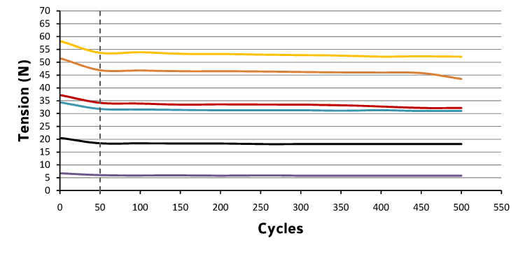 Sur les 501 cycles, les chercheurs ont observé une diminution de la tension de 5 à 12 % pour une déformation de 100 % de la longueur initiale, et une diminution de la tension de 10 à 15 % pour une déformaiton de 200 % de la longueur initiale. Néanmoins cette baisse de tension est intervenue lors des 50 premiers cycles, et la tension est ensuite restée constante sur les cycles suivants.