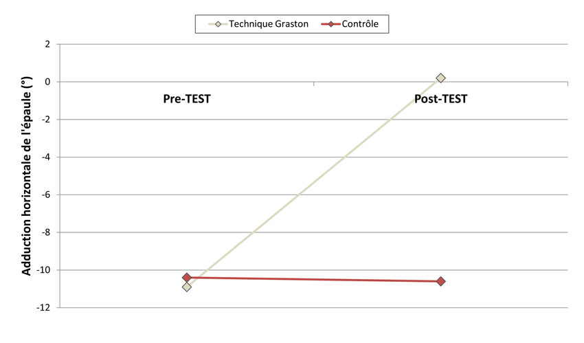 Les principaux résultats de cette étude montrent qu’une brève intervention de 40s de mobilisation assistée par un instrument métallique (i.e., technique Graston) de la zone postérieure de l’épaule permet d’améliorer significativement l’amplitude de l’articulation gléno-humérale (+11° en adduction horizontale et +4.8° en rotation interne) (Fig. 4 et 5).