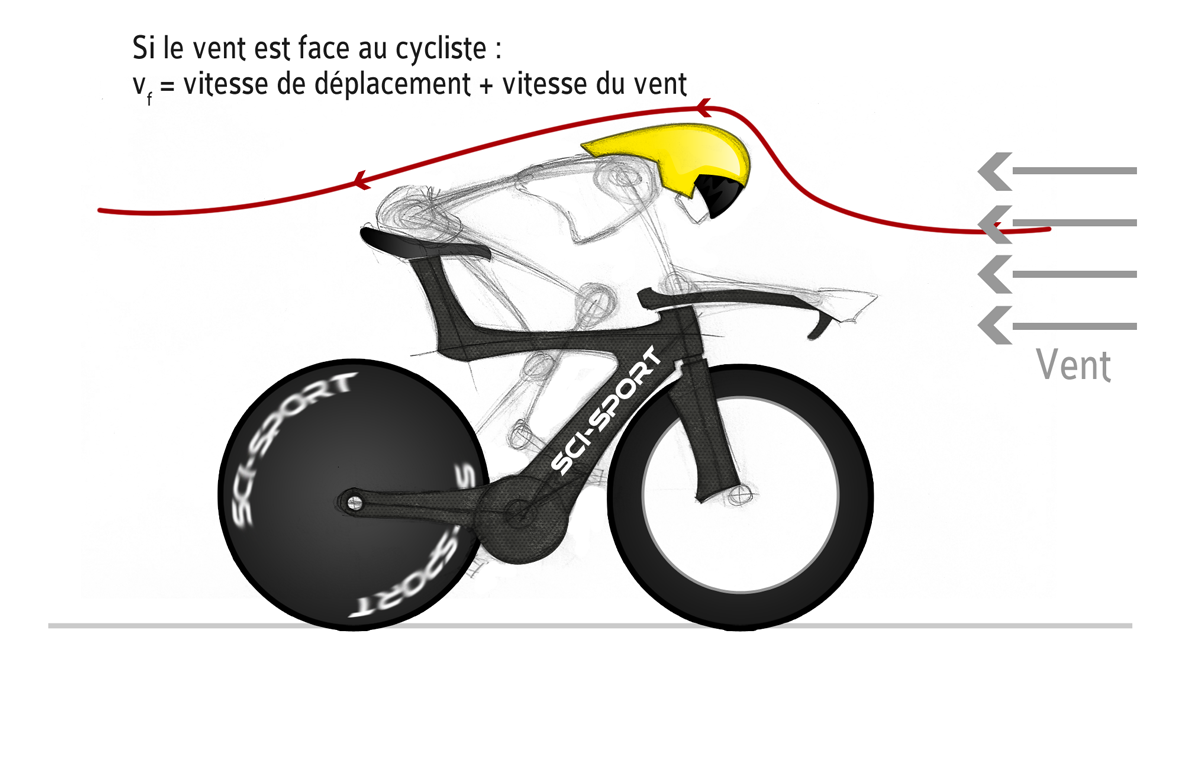 Lorsque le vent souffle dans le dos du cycliste, celui-ci aura l’impression d’avancer plus rapidement ou tout du moins avec plus de facilité. En effet, le vent qui souffle dans le sens opposé au déplacement des molécules d’air sur le corps permettra de diminuer la vitesse d’écoulement du fluide sur le corps (vf) et donc de diminuer la résistance aérodynamique (Fig. 5). Inversement, si le vent souffle face au cycliste, celui-ci se sentira freiné. Dans ce cas, le vent augmente la vitesse de déplacement du fluide sur le corps du cycliste. Il en résulte une augmentation de la résistance aérodynamique (Fig. 6).