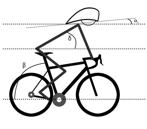 L’aire frontale projetée peut aussi être exprimée en fonction de la position du cycliste sur sa bicyclette en utilisant l’inclinaison du tube de selle (β, en degrés), l’inclinaison du tronc du cycliste par rapport à l’horizontal (δ, en degrés) (Fig. 8) :30,31
