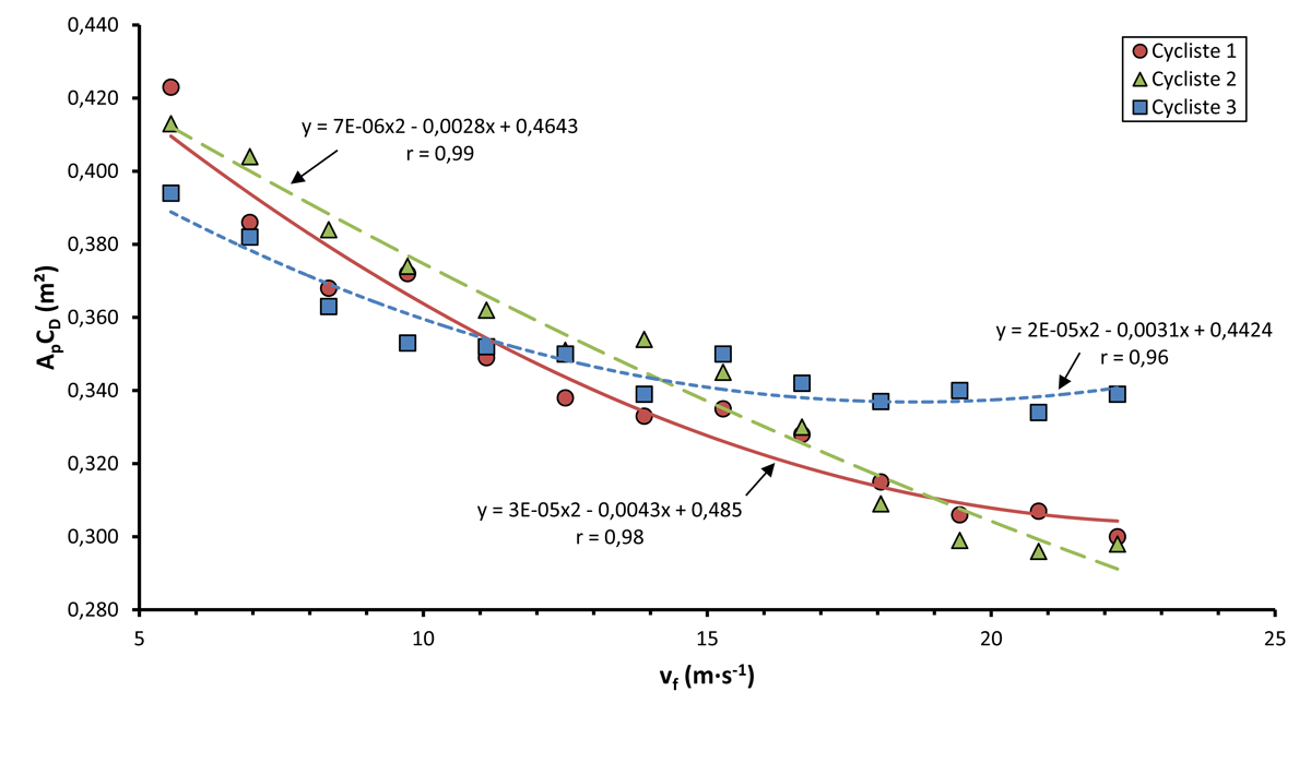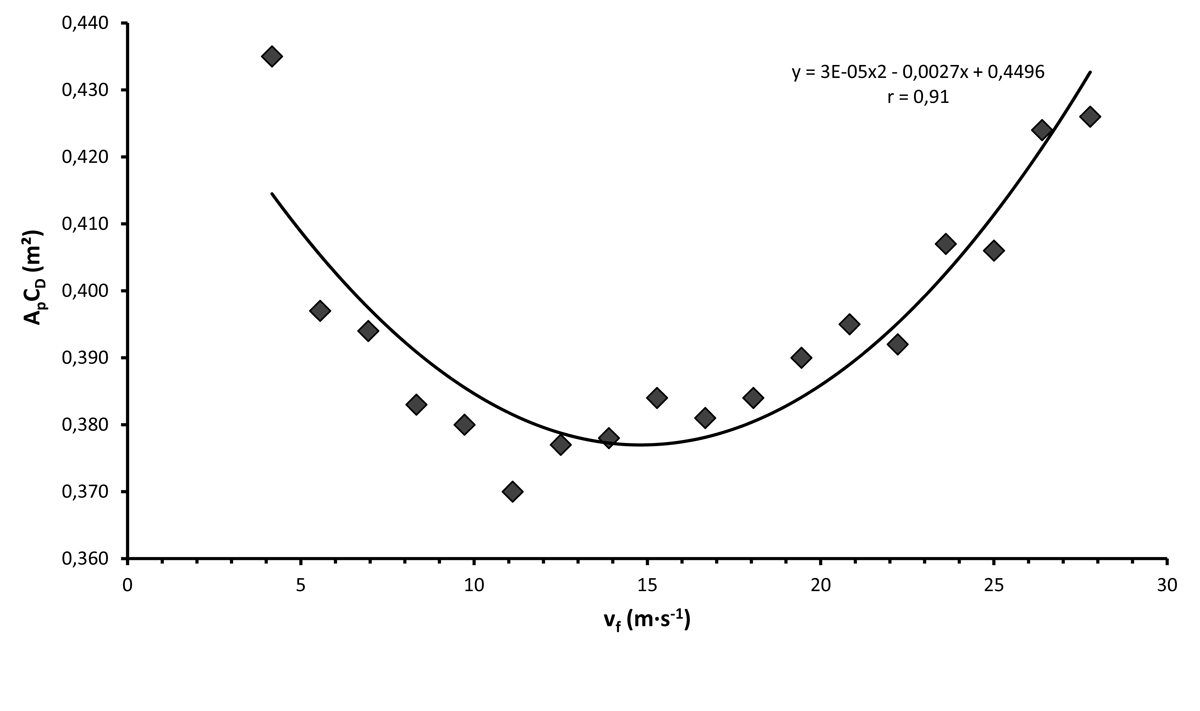 Lors de recherches récentes en soufflerie, Grappe (2009) a montré que la relation entre l’aire frontale effective (ApCD, m2) et la vitesse de l’air était hyperbolique (Fig. 18). Les mesures ont été réalisées avec un cycliste de haut-niveau sur une bicyclette de route traditionnelle en position traditionnelle aérodynamique (TAP), où le tronc est parallèle au sol, avec les mains positionnées sur la partie basse du guidon et avec les coudes fléchis à 90°. Ces données indiquent que ApCD diminue entre 4,2 et 11,1 m·s-1, et augmente entre 11,1 et 13,9 m·s-1.