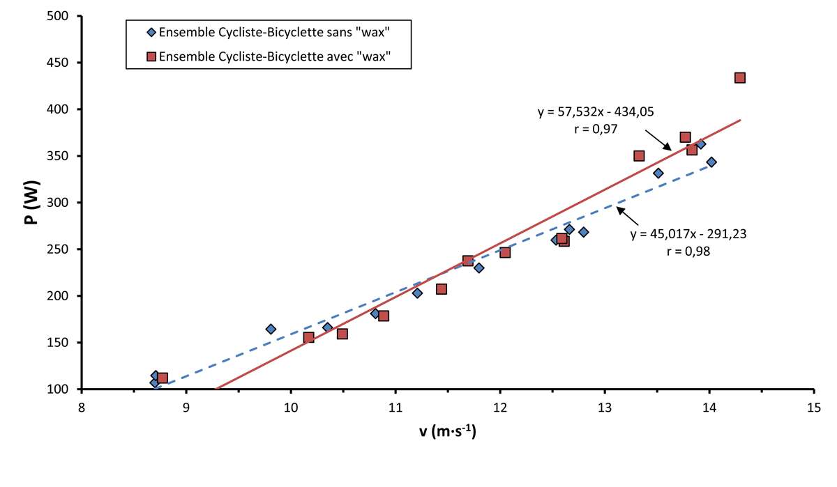 Entre 11 et 12 m·s-1, il n’existe aucune différence entre les deux conditions expérimentales. Entre 8,7 et 11 m·s-1, le traitement de surface permet une augmentation de la vitesse du système cycliste – bicyclette pour la même puissance mécanique produite. Cependant, pour des vitesses de déplacement plus grandes que 12 m·s-1, la vitesse n’augmente pas dans la condition où le traitement est appliqué.