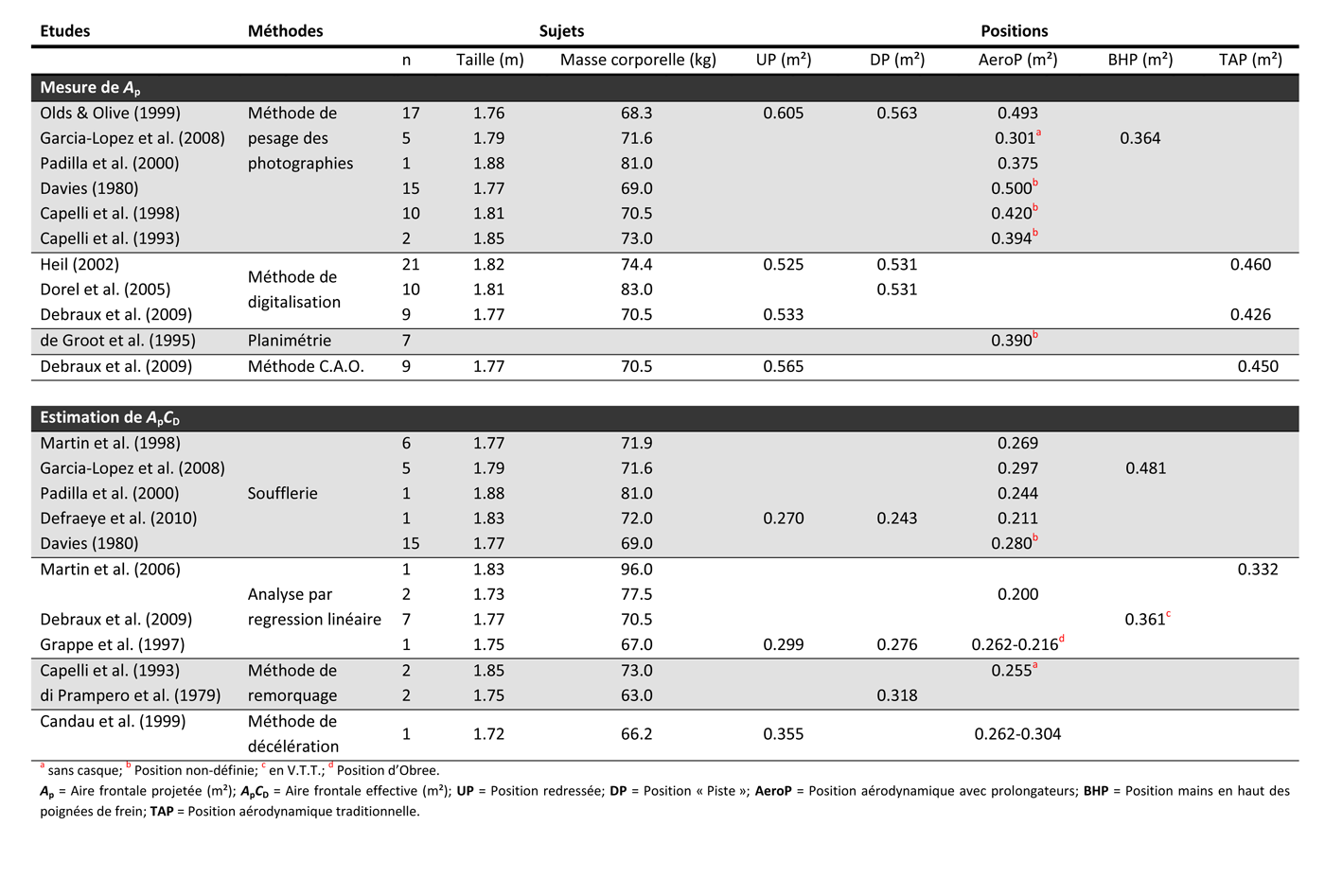 Toutefois, Garcia-Lopez et al. (2008) ont observé une faible corrélation entre l’angle du tronc et l’aire frontale projetée (r = 0.42, p < 0.05). Faria et al. (2005) ont proposé une formule pour déterminer Ap en position dite aérodynamique avec un guidon équipé de prolongateurs en utilisant mc et hc :