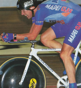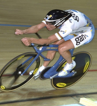 Les Figures 12 à 17 (ci-dessous) illustrent les différents recordmen du Record de l’heure au cours du temps et les différentes positions adoptées. Les photographies sont classées par CD décroissant. Il faut toutefois retenir que la position très aérodynamique d’Obree ne lui permettait pas de produire une grande puissance. Sur ces 6 exemples, c’est Boardmann, en 1996, qui a trouvé le meilleur compromis aérodynamisme-production de puissance avec sa position “Superman”.