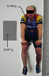 Cette méthode consiste à prendre une photographie du cycliste, de sa bicyclette et d’une zone d’étalonnage dont l’aire est connue dans le plan frontal (Fig. 24). La photographie est développée sur papier puis découpée. Il faut en fait découper 2 parties : la zone d’étalonnage et le corps du cycliste (Fig. 25). Ces deux parties sont ensuites pesées à l’aide d’une balance dont la sensibilité est plus ou moins de 0.001g (Fig. 26).