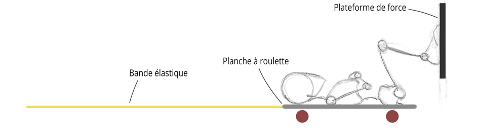 - Squat Jump horizontal (HSJAssist) : Un saut horizontal allongé sur une planche à roulette avec une bande élastique fixée 3 mètres derrière qui tracte la planche (95-110 N d’assistance) (Fig. 1). Les participants se maintenaient en place à l’aide de câbles placés de part et d’autre.