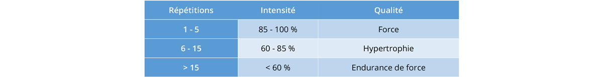 Dans cette partie, nous traiterons du problème induit par la “segmentation” des qualités physiques, ou plus précisément, de pourquoi le fait d’envisager un phénomène physiologique (ou une qualité physique) de manière isolée peut conduire à des erreurs de programmation dans l’entrainement. Pour prendre un exemple concret, penchons-nous sur le cas des tableaux de charges, mettant en relation des qualités de force avec des fourchettes de répétitions en musculation (Fig. 3).