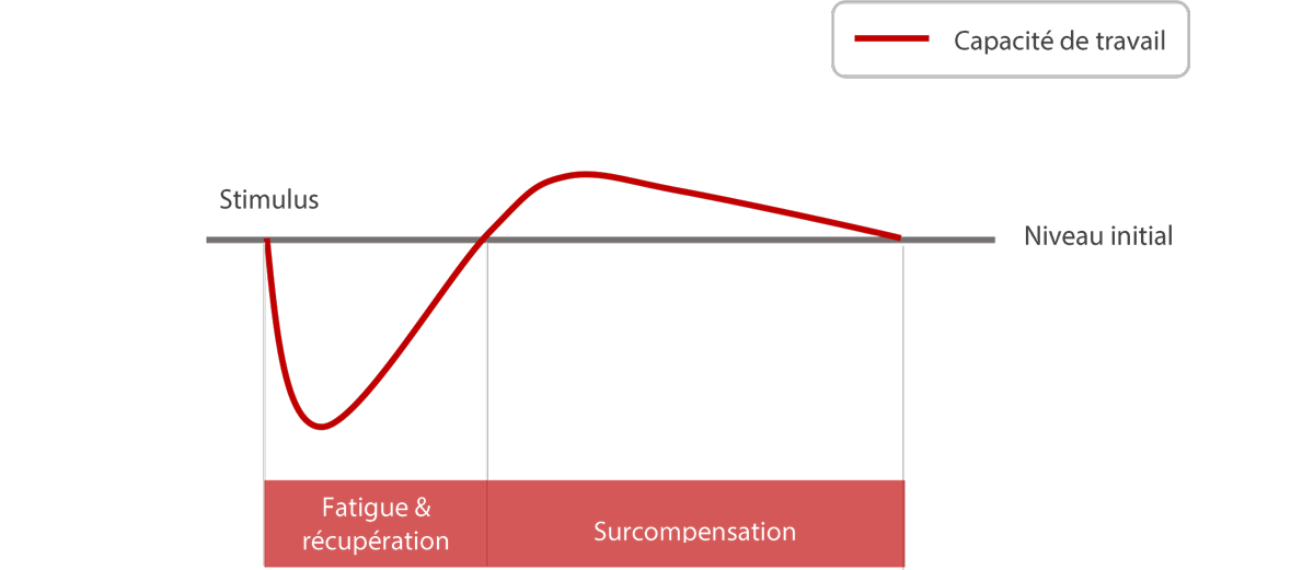 Ainsi, à l’issue d’un stimulus initial survient la première phase du cycle de surcompensation, caractérisée par un état de fatigue (central et périphérique) proportionnel à la magnitude du stress appliqué. Cette phase aigüe met en jeu les mécanismes de récupération du corps qui vont permettre, à l’issue de cette phase (et si aucun autre stress n’intervient à nouveau) de rétablir les capacités physiques de l’athlète. Tout stress étant vécu comme une “attaque” pouvant potentiellement mettre en jeu la survie de l’individu, le corps va alors chercher à mieux se préparer, en prévision d’une seconde confrontation au stress de la phase 1. Il va donc renforcer spécifiquement les systèmes précédemment sollicités. En effet, nos processus adaptatifs ne sont pas naturellement orientés pour améliorer nos performances dans un sport donné, augmenter la masse musculaire, ou diminuer le pourcentage de masse graisseuse. Notre vie moderne les détourne de leurs fonctions premières, pour répondre à des préoccupations moins vitales, d’ordres récréatifs, esthétiques, ou de santé. Enfin, après un certain temps passé sans nouvelle confrontation à un stress de même nature, les adaptations acquises dans la phase de surcompensation régressent progressivement jusqu’à retrouver leur niveau initial (de préstimulation).