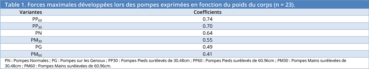 Les tests statistiques réalisés ont montré une différence significative entre chaque variante de pompes. Cela signifie que les différentes variantes testées permettent distinctement une augmentation / diminution progressive de la résistance lors de l’exercice. La résistance variera d’environ 41% à 74% du poids de corps. De plus, aucune différence au niveau des coefficients n’a été relevée entre les femmes et les hommes.